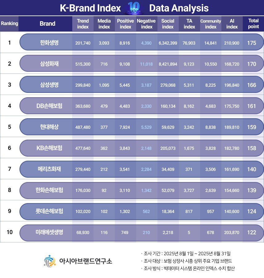이번 K-브랜드지수 보험 상장사 부문은 보험 상장사 시총 상위 주요 기업 브랜드를 대상으로, 2025년 8월 1일부터 8월 31일까지의 온라인 빅데이터 2203만 8371건을 분석했다.