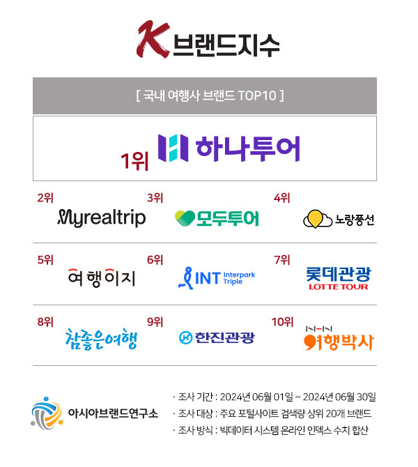 | K-브랜드지수 여행사 부문 톱10. [사진=아시아브랜드연구소] |