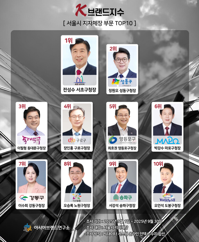K-브랜드지수 서울시 지자체장 부문은 전성수 서초구청장이 1위를 차지했으며, 정원오 성동구청장(2위), 이필형 동대문구청장(3위), 장인홍 구로구청장(4위), 최호권 영등포구청장(5위), 박강수 마포구청장(6위), 이수희 강동구청장(7위), 오승록 노원구청장(8위), 서강석 송파구청장(9위), 오언석 도봉구청장(10위) 등이 TOP10에 이름을 올렸다.
