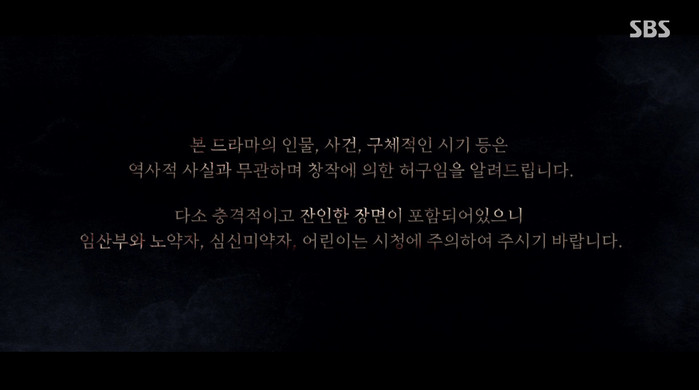 방송 시작에 앞서 자막을 통해 "본 드라마의 인물, 사건, 구체적인 시기 등은 역사적 사실과 무관하며 창작에 의한 허구임을 알려드립니다"라고 안내했다.