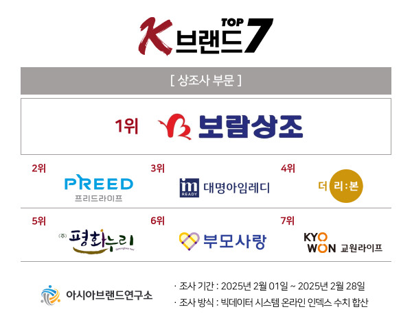 [하비엔뉴스 = 정동환 기자] 빅데이터 평가 기관인 아시아브랜드연구소는 ‘K-브랜드 톱7’ 상조사 부문 1위에 보람상조가 선정됐다고 31일 밝혔다.