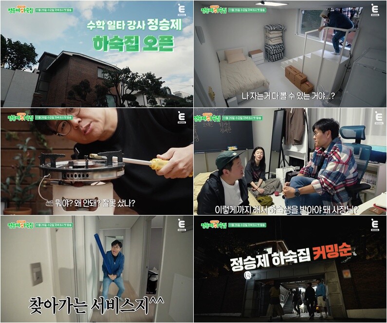 26일(수) 밤 첫 방송 예정인 E채널 ‘정승제 하숙집’은 인생 때려잡고 싶은 젊은이들이 밥도 청춘도 나누며, '정승제 생선님'에게 인생 수업도 받는 뉴노멀 하숙 관찰 예능이다. 정승제가 칠판 분필 대신 밥주걱을 잡고 ‘어른이 하숙생’들에게 인생 간섭을 해주며, 정형돈은 ‘하숙집 학생주임’으로, 한선화는 ‘하숙집 살림꾼’으로 호흡을 맞춘다.