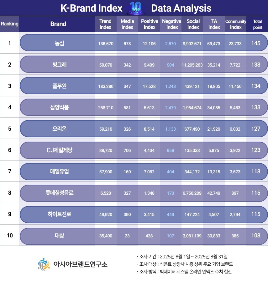 이번 K-브랜드지수 식음료 상장사 부문은 식음료 상장사 시총 상위 주요 기업 브랜드를 대상으로, 2025년 8월 1일부터 8월 31일까지의 온라인 빅데이터 3642만 7966건을 분석했다.