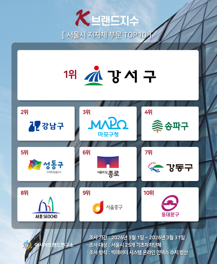 한정근 아시아브랜드연구소 대표는 “이번 K-브랜드지수는 서울시 각 자치구의 정주 여건 개선과 구민 체감형 행정 서비스 역량이 브랜드 밸류에 입체적으로 반영된 것으로 분석된다. 특히 새롭게 1위로 도약한 강서구는 생활 인프라 확충과 지역 균형 발전을 향한 노력이 긍정적인 평가로 이어지며 정상에 올랐다"고 설명했다.