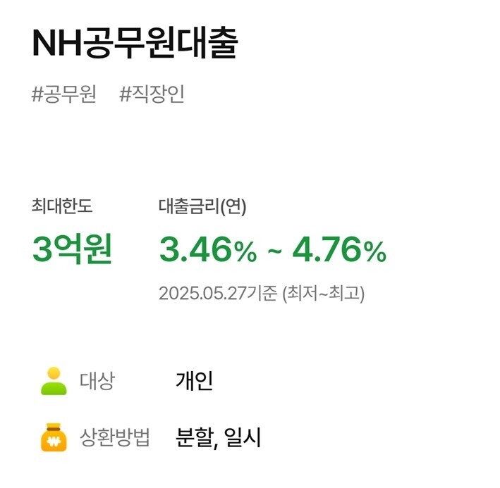 28일 금융권에 따르면 NH농협은행은 전날부터 'NH공무원대출'의 마이너스 대출 한도를 기존 1억원에서 3억원으로 상향 조정했다.일반 대출 한도는 기존 3억원을 유지했다.