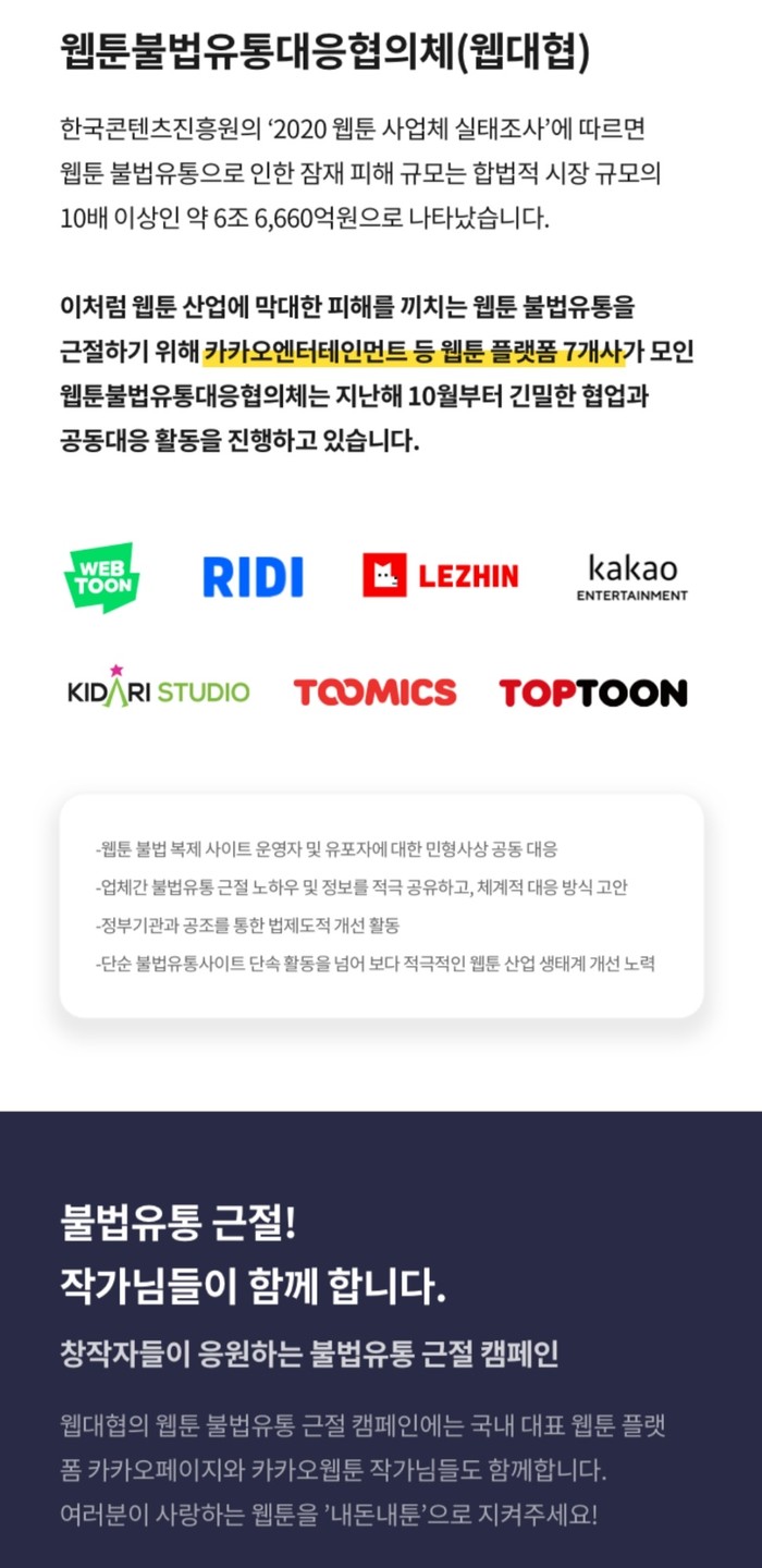 작가의 창작욕과 수익을 심각하게 저해하는 불법유통을 막아 소중한 저작권을 지키고, 세계로 뻗어나가는 웹툰을 육성하겠다는 목표 아래서다. 실제 한국콘텐츠진흥원 ‘2020 웹툰 사업체 실태조사’에 따르면 웹툰 불법유통 잠재 피해 규모는 합법적 시장 규모 10배 이상인 약 6조 6,660억원에 이르는 것으로 나타났다.