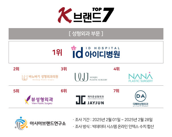 [하비엔뉴스 = 정동환 기자] 빅데이터 평가 기관인 아시아브랜드연구소는 K-브랜드 톱7 성형외과 부문 1위에 아이디병원이 선정됐다고 10일 밝혔다.