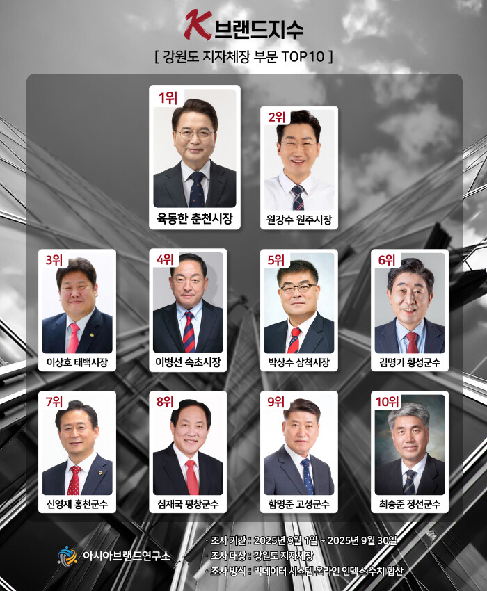 한정근 아시아브랜드연구소 대표는 “이번 K-브랜드지수 강원도 지자체장 부문에서는 지역 간 브랜드 격차가 빠르게 좁혀지는 흐름이 감지된다. 기존 시(市) 중심의 강세가 이어지는 가운데, 군(郡) 단위에서도 브랜드 경쟁력이 강화되며 지역 리더십의 다변화가 본격화되는 양상”이라고 평가했다.
