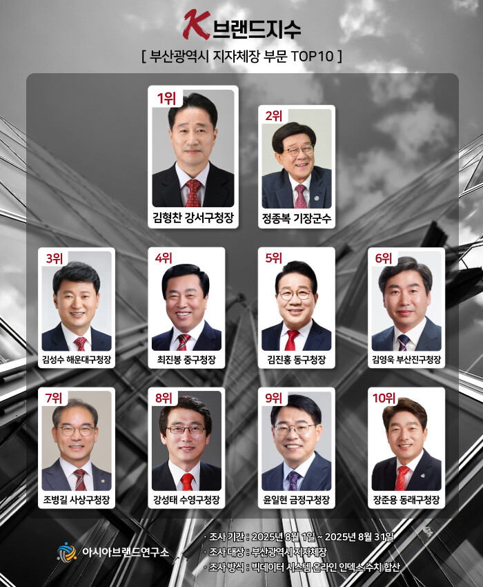 이어 “이번 K-브랜드지수 부산 지자체장 부문의 빅데이터 결과는 지방행정이 점차 브랜드화되는 흐름을 반영한 것으로 해석된다. 김형찬 강서구청장이 1위에 등극하며 주민 신뢰와 정책 성과를 동시에 인정받았고, 정종복 기장군수와 김성수 해운대구청장이 뒤를 이으며 리더십 경쟁이 주목되는 상황”이라고 덧붙였다.