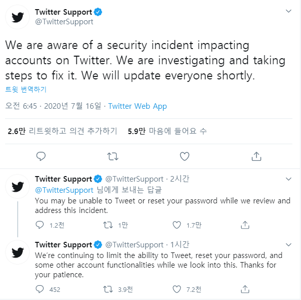 이후 트위터 공식 계정에는 "보안사고를 알고 있다. 문제를 해결하기 위해 조사하고 조치를 취하는 중이다"고 입장을 밝혔다.