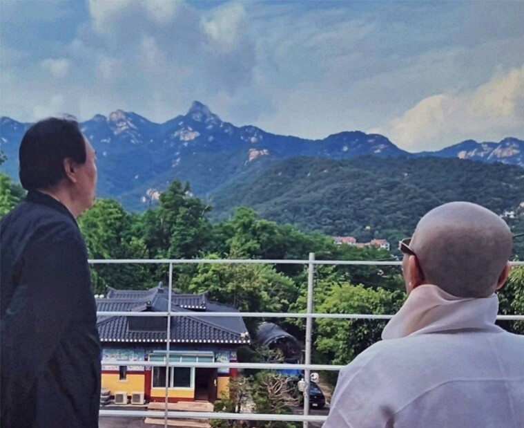 | 지난 2021년 당시, 자비정사에서 묘심 종정과 윤석열 검찰총장이 북한산을 바라보고 있다. [사진=자비정사] |