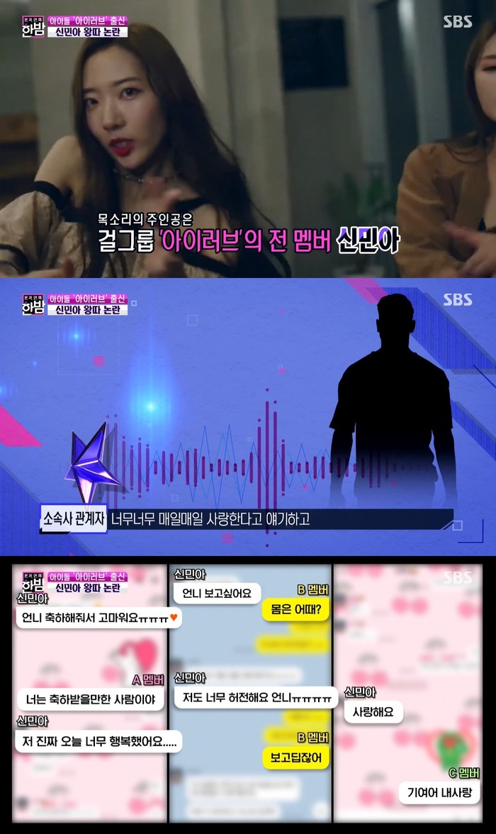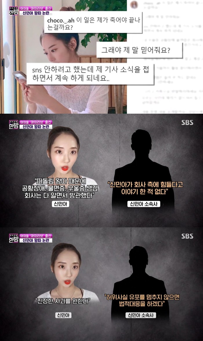 앞서 지난 22일 SBS '본격연예 한밤'에서는 최근 극단적 선택을 시도하는 등 그룹 아이러브 6명 멤버들에 괴롭힘을 당해왔다고 고통을 호소한 전 멤버 신민아의 이야기가 다뤄졌다.