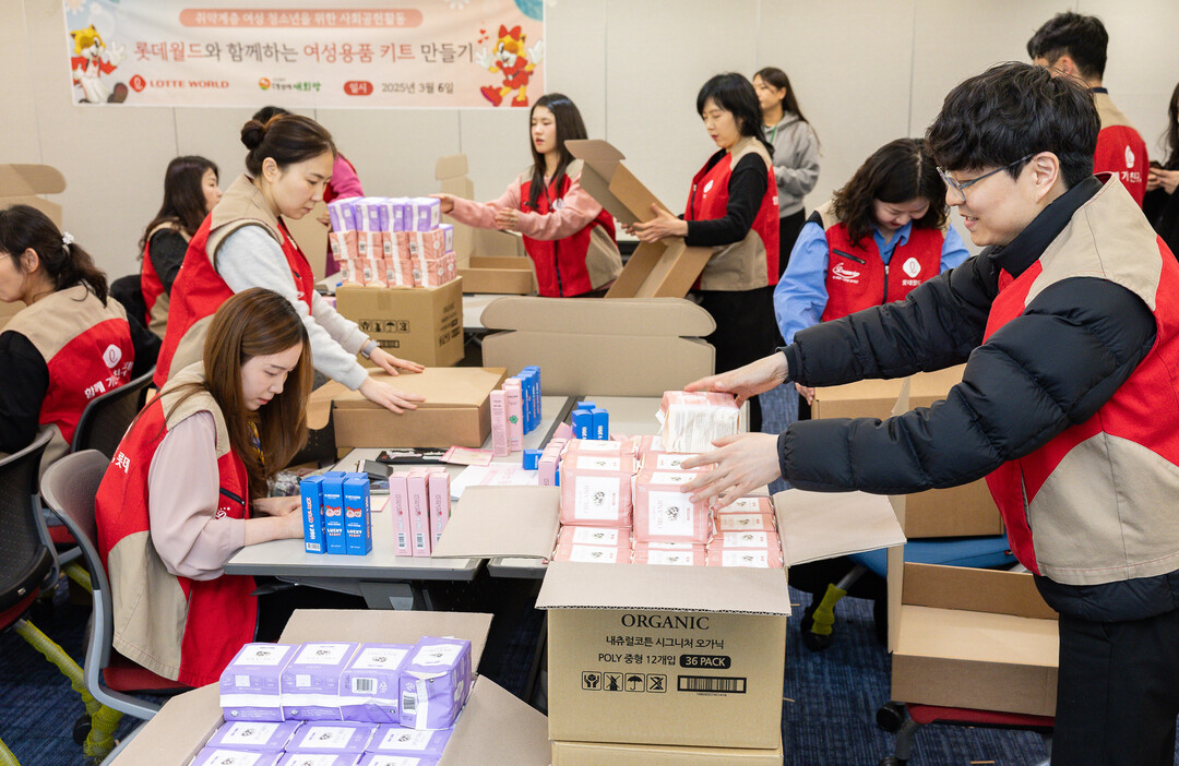 | 롯데월드 샤롯데 봉사단의 여성용품 키트 봉사활동. [사진=롯데월드] |