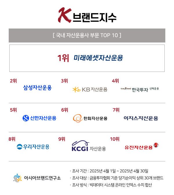 K-브랜드지수 자산운용사 부문은 미래에셋자산운용이 1위를 수성했으며, 삼성자산운용(2위), KB자산운용(3위), 한국투자신탁운용(4위), 신한자산운용(5위), 한화자산운용(6위), 이지스자산운용(7위), 우리자산운용(8위), KCGI자산운용(9위), 유진자산운용(10위)이 TOP10의 영예를 차지했다.