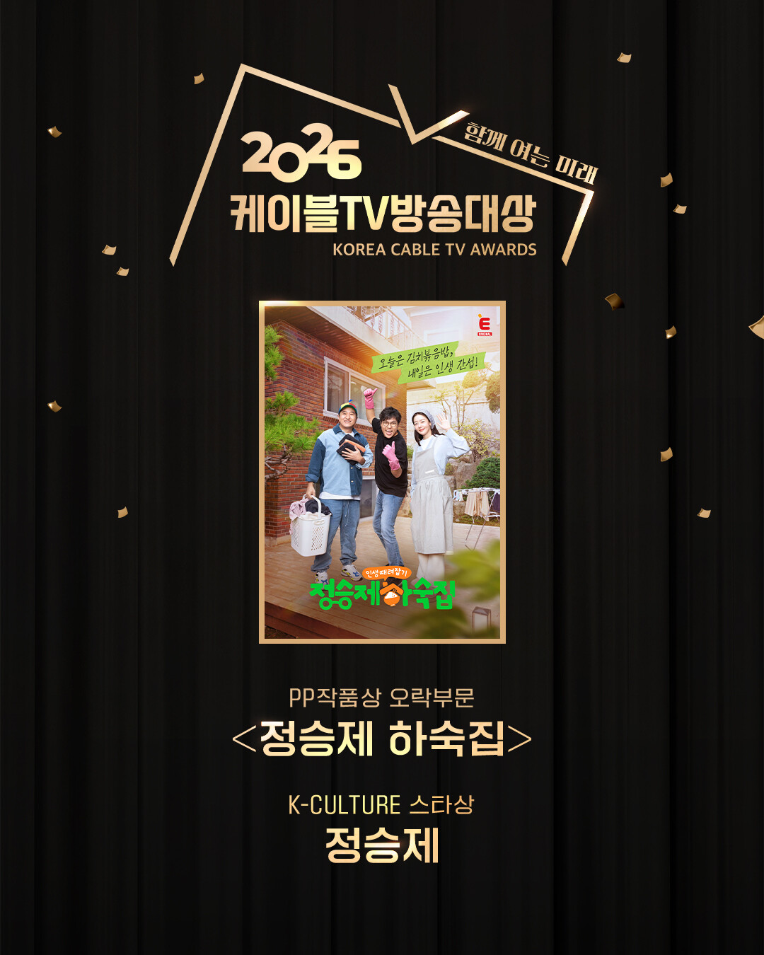 티캐스트 E채널 ‘정승제 하숙집’은 지난 15일 서울 마포구 호텔나루 서울 엠갤러리에서 열린 ‘2026 케이블TV방송대상’(주최 한국케이블TV방송협회)에서 오락 부분 작품상 수상작으로 선정되는 것은 물론, 출연자인 정승제가 K-컬쳐 스타상을 타는 경사를 맞았다.