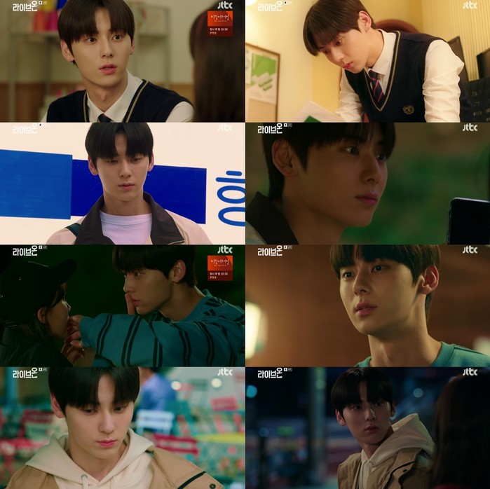 지난 22일 방송된 JTBC 미니시리즈 ‘라이브온’에서 고은택(황민현 분)은 수련회를 떠나 백호랑(정다빈 분)과 한층 더 가까워지며 설렘 지수를 상승시키는가 하면 학교를 발칵 뒤집어놓은 폭로의 진실에 점점 다가가 손에 땀을 쥐게 했다.