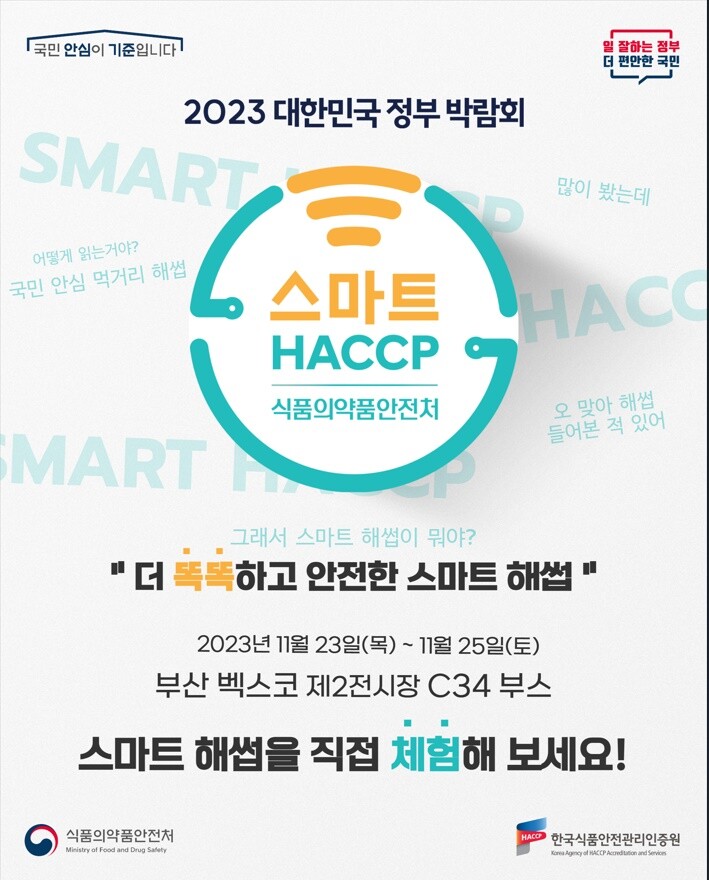 [하비엔뉴스 = 이필선 기자] 식품의약품안전처와 한국식품안전관리인증원(이하 ‘해썹인증원’)은 23일부터 오는 25일까지 부산 벡스코(BEXCO)에서 개최되는 ‘2023 대한민국 정부 박람회(행정안전부 주관)’에 참가해 스마트 해썹 홍보관을 운영한다.