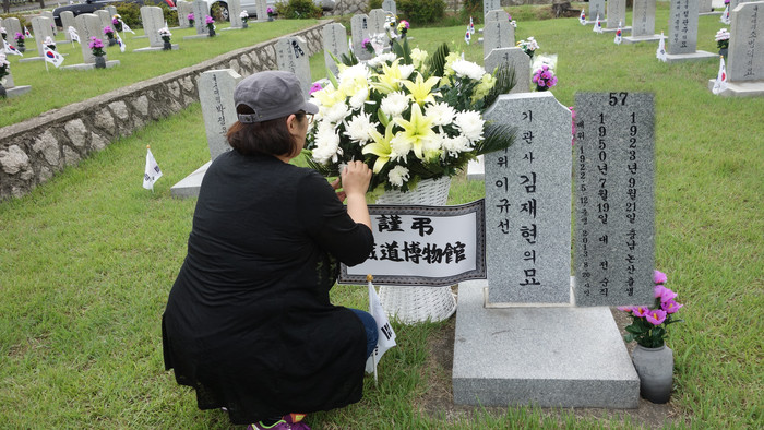 | ▲ 현충일 철도박물관 긴재현기관사 묘소 헌화 |