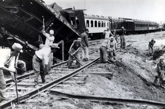 | ▲파괴된 선로를 복구하는 철도원 |