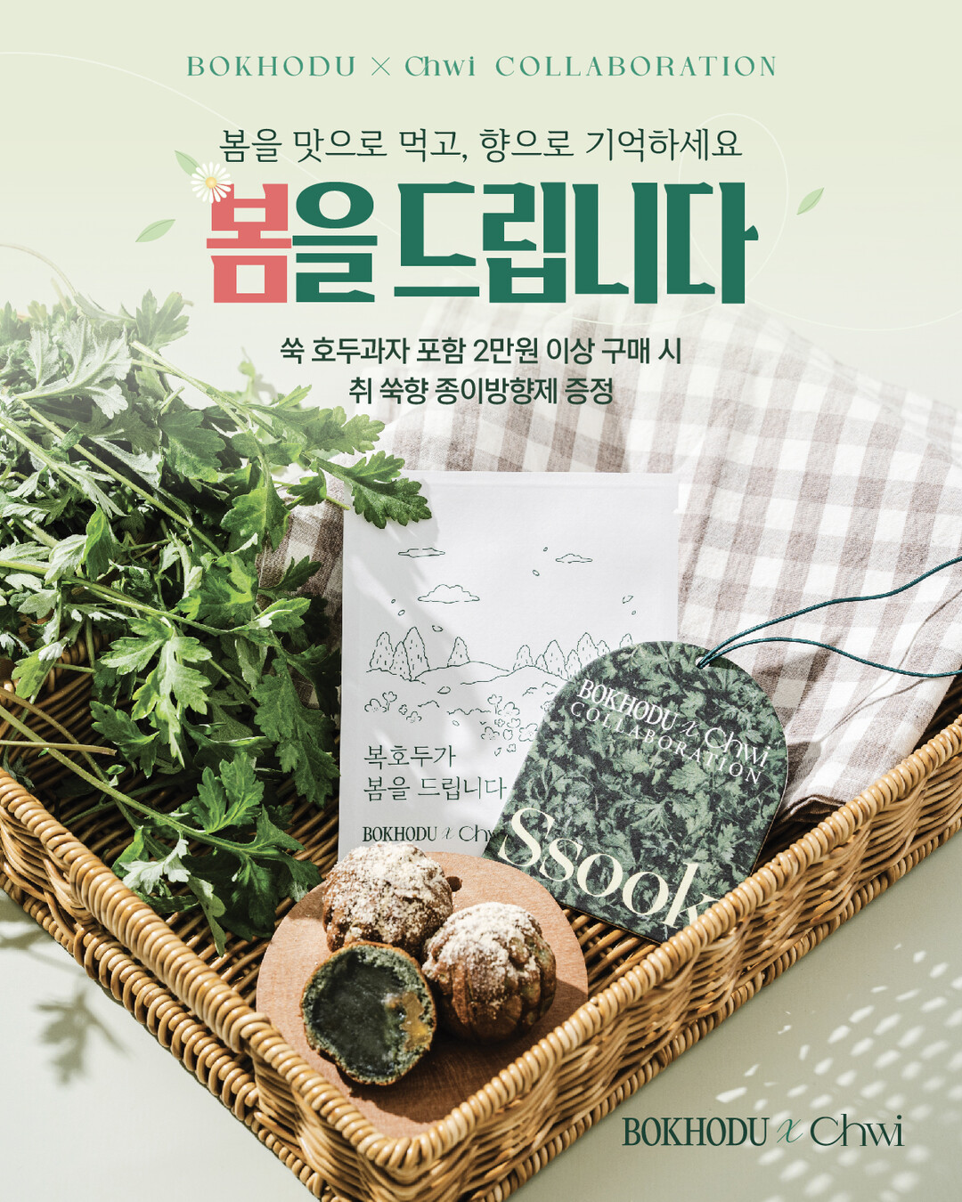 이를 기념해 복호두는 매장에서 쑥 호두과자를 포함해 2만원 이상 구매 시 취의 ‘쑥 향 종이 방향제’를 선착순으로 증정하는 ‘봄을 드립니다’ 이벤트를 진행한다. 해당 방향제는 봄에 피어나는 쑥 잎의 달콤하고 향긋한 향에 바닷바람의 공기감을 더해 깊고 맑은 허브 향을 느낄 수 있도록 제작됐다.