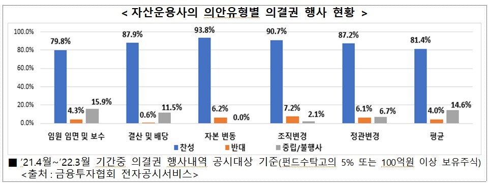 | 자산운용사의 의안유형별 의결권 행사 현황. [자료=금융투자협회] |