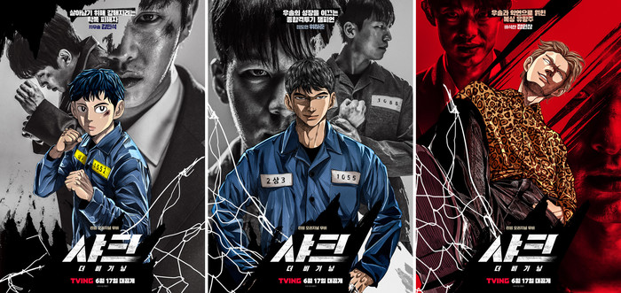 티빙 오리지널 무비 <샤크 : 더 비기닝>은 뜻밖의 사고로 소년 교도소에 수감된 학폭 피해자 차우솔(김민석)이 종합격투기 챔피언 정도현(위하준)을 만나 자신의 한계를 하나씩 부숴나가는 리얼 생존 액션. <샤크 : 더 비기닝>이 인기 웹툰 작가이자 원작자 김우섭 작가가 직접 그린 작화를 담아낸 캐릭터 포스터를 공개해 눈길을 끈다.