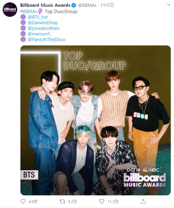 방탄소년단고 함께 ‘톱 듀오/그룹’ 부문 후보에 오른 아티스트는 댄 앤 셰이, 조나스 브라더스, 마룬5, 패닉 앳 더 디스코 등이다. ‘톱 소셜 아티스트’ 부문에선 방탄소년단을 비롯한 국내 아티스트인 엑소, 빌리 아일리시, 갓세븐, 아리아나 그란데가 경쟁을 펼친다.