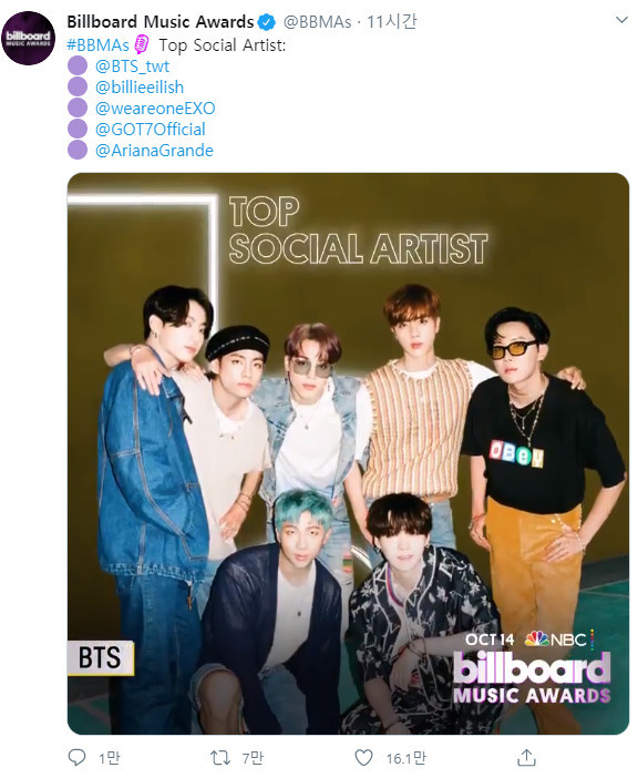 한편 2020 ‘빌보드 뮤직 어워즈’는 10월 14일 오후 8시(미 동부시간) 미국 로스앤젤레스(LA) 돌비 시어터에서 진행되며 NBC 방송을 통해 생중계된다.