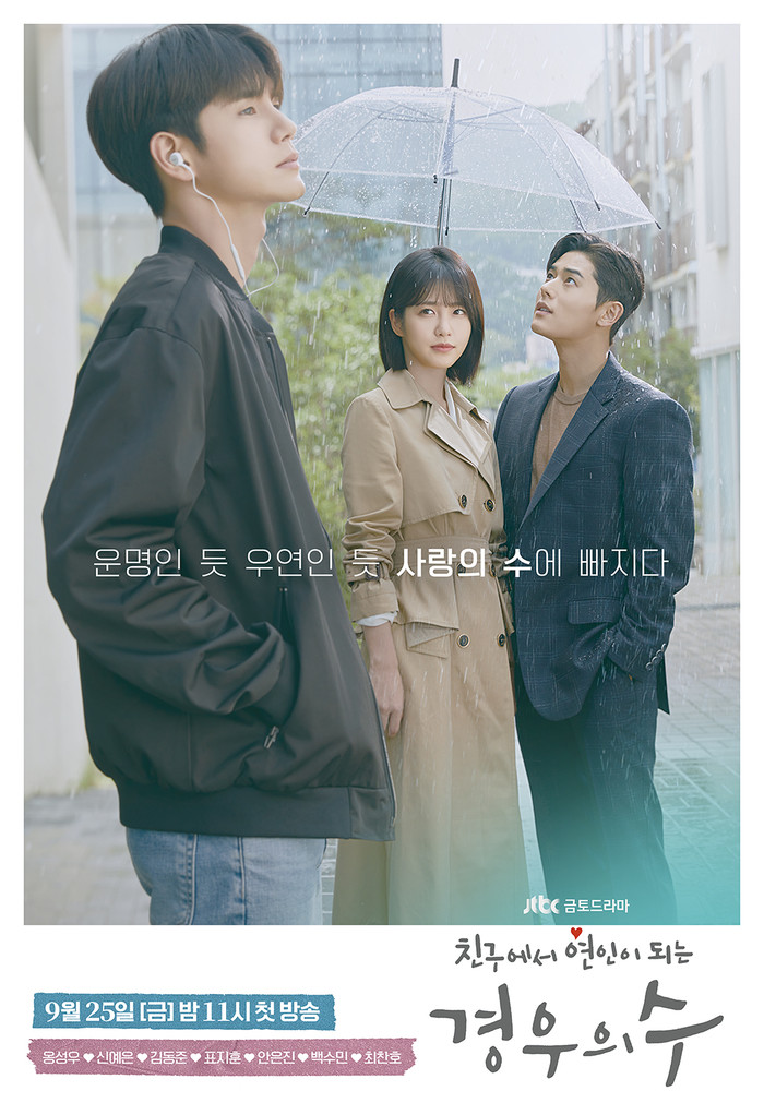 이날 공개된 3차 포스터에는 갑작스럽게 내린 소나기처럼, 불쑥 찾아온 사랑에 온 마음을 적신 이수와 경우연, 온준수의 짧은 순간이 담겼다. 상념에 잠긴 이수는 이어폰을 꽂은 채 거리를 걷고 있다. 그런 이수를 한 발짝 뒤에서 바라보는 경우연. 익숙하게 이수를 좇는 눈빛에는 어딘지 아련한 분위기가 느껴진다. 이수를 향한 경우연의 마음을 아는지 모르는지, 온준수는 한쪽 어깨를 적시며 그에게 우산을 씌워준다. 찰나의 순간 포착된 세 사람의 서로 다른 마음은 짜릿한 삼각 로맨스의 시작을 알린다. 엇갈린 시선 위로 “운명인 듯 우연인 듯 사랑의 수에 빠지다”라는 문구는 경우연에게 찾아온 운명의 ‘수’가 누구일지 호기심을 자극한다.