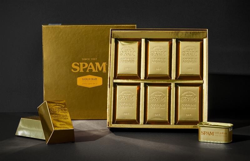 스팸 골드바 에디션은 골드바 모양의 종이 상자 안에 스팸이 들어있는 제품이다.