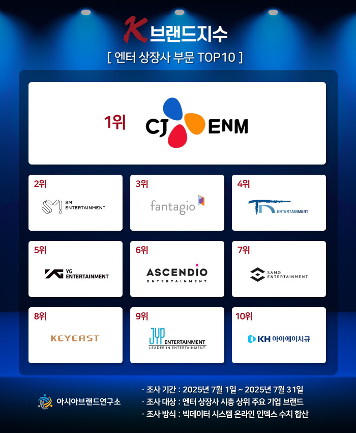 K-브랜드지수 엔터 상장사 부문은 CJ ENM이 1위를 차지했으며, 에스엠(2위), 판타지오(3위), 티엔엔터테인먼트(4위), 와이지엔터테인먼트(5위), 아센디오(6위), SAMG엔터(7위), 키이스트(8위), JYP Ent.(9위), IHQ(10위)이 TOP10에 이름을 올렸다.