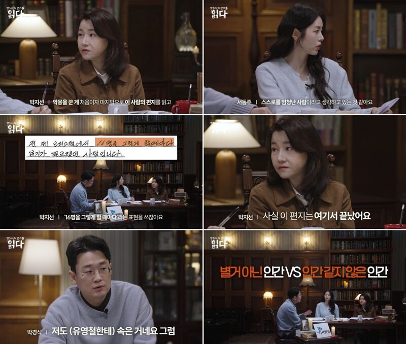 30일(오늘) 공개되는 ‘읽다’ 5회에서 박지선은 “범죄자를 두려워하지 않는 편인데, 유영철의 편지를 읽고 처음이자 마지막으로 악몽을 꿨다”라고 밝혀 궁금증을 자아낸다. 박지선은 유영철에 대해 “알려진 살인 피해자만 20명인 희대의 인물”이라고 설명한 뒤, “편지를 읽다 보면 유영철이 원하는 방향대로 교묘하게 말려 들어가는 느낌을 받는다. 사람을 조종하는 데 능한 인물이라, 이런 점 때문에 악몽을 꾼 것 같다”라고 전한다.