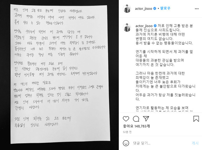 지수는 4일 오전 자신의 인스타그램에 "저로 인해 고통 받은 분들께 진심으로 사죄드립니다. 과거에 저지른 비행에 대해 어떤 변명의 여지도 없습니다. 용서 받을 수 없는 행동들이었습니다"라고 사죄의 말을 적었다.