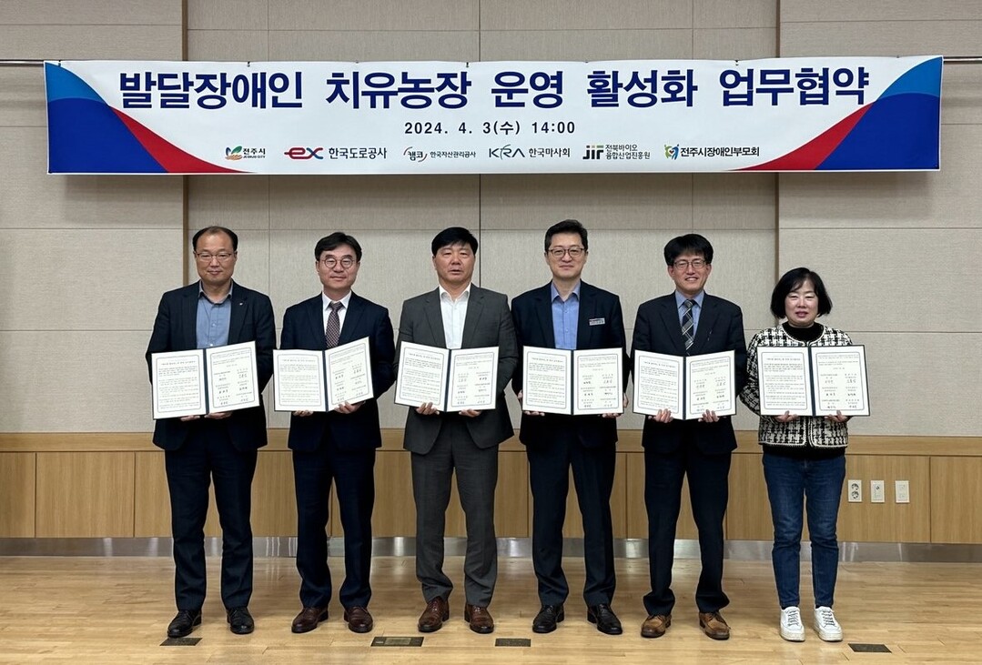 [하비엔뉴스 = 윤대헌 기자] 한국마사회 장수목장은 지난 3일 발달장애인의 활동 지원을 위해 전주시, 한국도로공사, 한국자산관리공사 전북본부 등 4개 기관과 치유농장(케어팜) 활성화를 위한 업무협약을 체결했다고 5일 밝혔다.