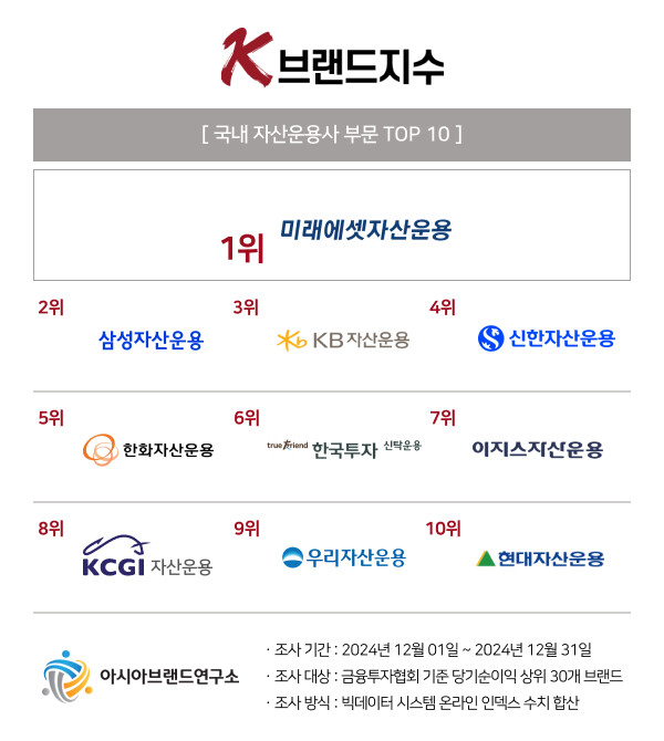 이번 K-브랜드지수 자산운용사 부문은 금융투자협회 기준 당기순이익 상위 30개 브랜드를 대상으로 지난 12월1~31일 온라인 빅데이터 1422만9567건을 분석했다.