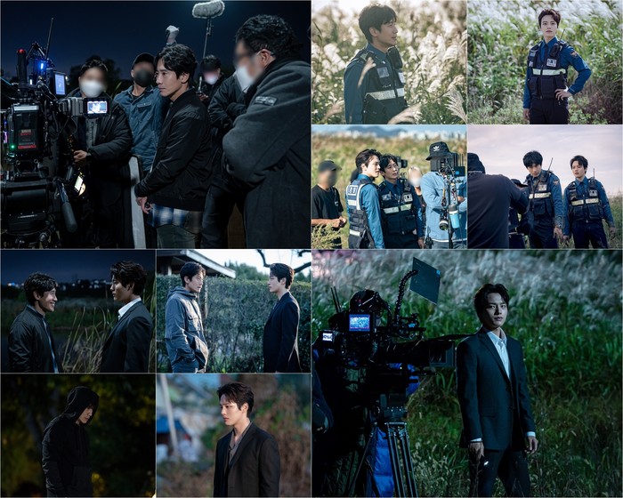 이날 공개된 비하인드 컷에서도 완벽한 시너지의 비결을 엿볼 수 있다. 먼저 ‘위험한 파트너’ 이동식, 한주원의 첫 임무 현장이 눈길을 끈다. 미묘한 신경전을 벌이던 두 사람이 처음으로 공공의 목표를 갖고 출동했던 갈대밭 장면. 신하균과 여진구는 끊임없이 의견을 주고받으며 호흡을 맞춰간다. 진지한 눈빛으로 모니터 1열을 사수한 두 남자의 열정이 빈틈없는 장면을 완성했다. ‘연기 괴물’의 아우라를 잠시 내려놓고 부드러운 미소를 짓는 모습은 훈훈함을 자아낸다.