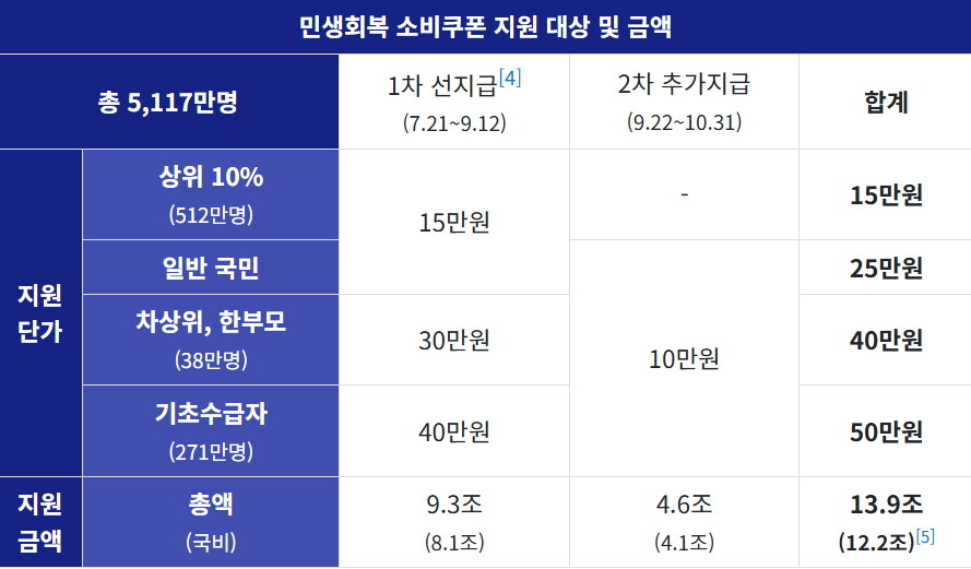 당초 정부 계획에 따르면 1차는 지난 7월 21일부터 9월 12일까지 전 국민을 상대로 1인당 15만~40만원까지 차등 지급된다. 1차 지급 규모는 9조 3000억원 규모다. 2차 추가 지급은 9월 22일부터 10월 31일까지 소득 상위 10%(512만명)를 제외한 국민 1인당 10만원 씩 추가 지급할 예정이었다. 2차 지급규모는 4조6000억원 규모다. 하지만 구 부총리의 발언처럼 결국 2차 소비쿠폰 추가 지급은 없던 일이 되어 버렸다.
