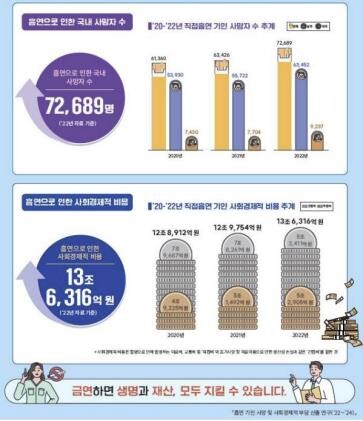 직접 흡연으로 인한 사망자 수는 2020년 6만1360명, 2021년 6만3426명, 2022년 7만2689명으로 점차 증가하는 추세다.