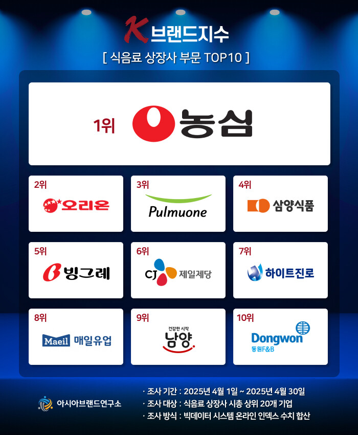 이번 K-브랜드지수 식음료 상장사 부문은 식음료 상장사 시총 상위 20개 기업을 대상으로, 2025년 4월 1일부터 4월 30일까지의 온라인 빅데이터 2034만 8264건을 분석했다.