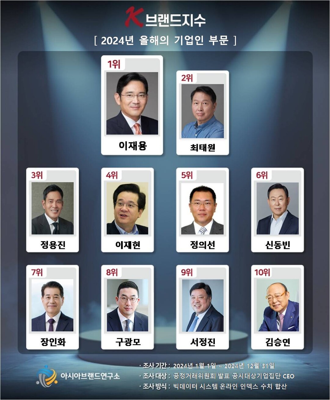 그 결과 이재용 회장(삼성)이 1위의 영예를 차지했고, 최태원 회장(SK), 정용진 회장(신세계), 이재현 회장(CJ), 정의선 회장(현대자동차), 신동빈 회장(롯데), 장인화 회장(포스코), 구광모 회장(LG), 서정진 회장(셀트리온), 김승연 회장(한화)이 톱10에 이름을 올렸다.