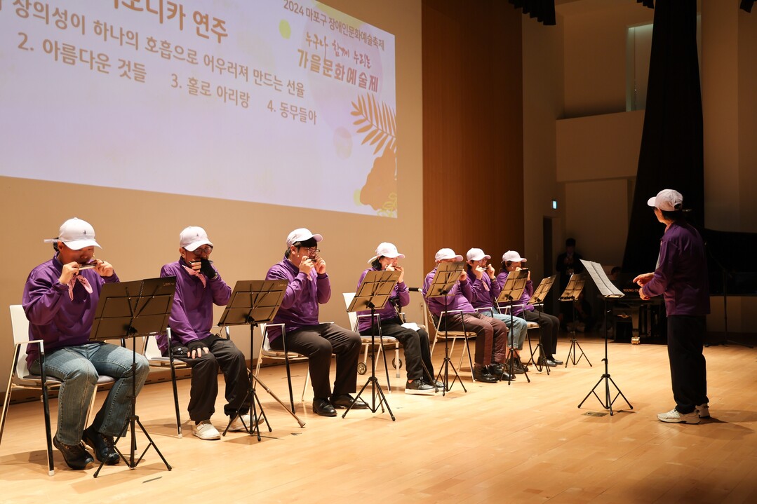 | 장애인 예술문화 공연발표회 ‘제1회 마포구 누구나 가을문화예술제’에서 마포장애인종합복지관의 하모니카 공연이 펼쳐졌다. [사진=마포구] |