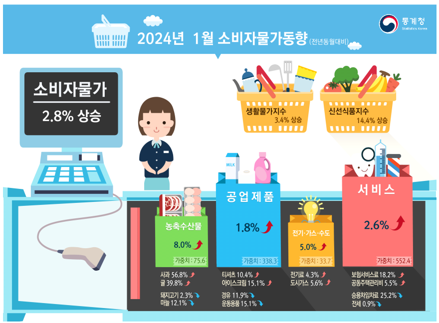 [하비엔뉴스 = 강유식 기자] 지난달 소비자물가지수가 전월과 전년 대비 각각 0.4%, 2.8% 상승했다. 소비자물가 상승률이 2%대로 내려온 것은 6개월 만이다.