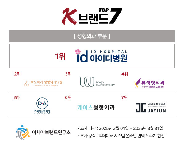 [하비엔뉴스 = 정동환 기자] 빅데이터 평가 기관인 아시아브랜드연구소는 ‘K-브랜드 톱7’ 성형외과 부문 1위에 아이디병원이 선정됐다고 7일 밝혔다.