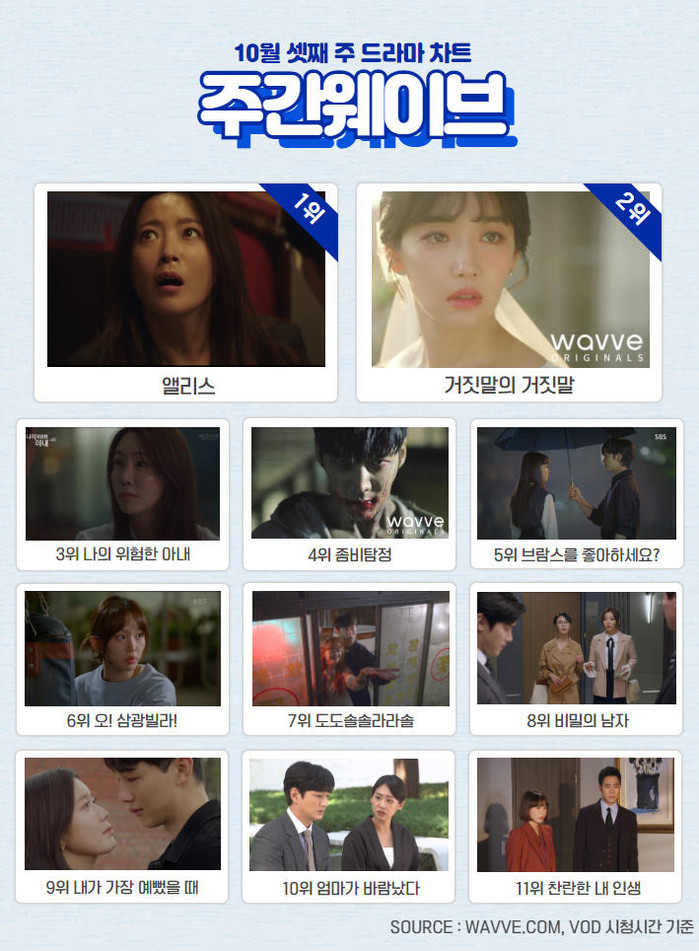 [하비엔=노이슬 기자] 10월 셋째 주 주간웨이브 국내 드라마 차트는 그야말로 웨이브 오리지널의 독주가 펼쳐졌다. '앨리스', '거짓말의 거짓말', '나의 위험한 아내', 그리고 '좀비탐정'이 1위부터 4위까지 점령한 것.
