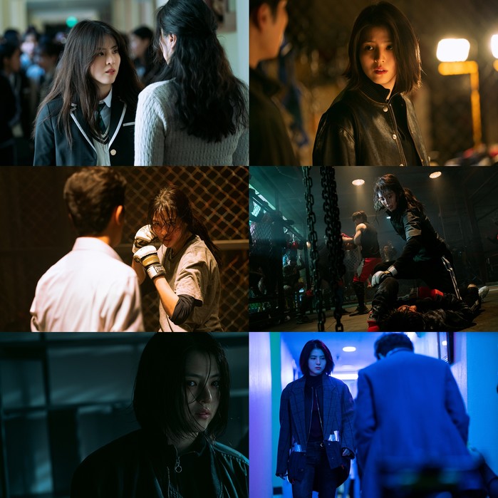 복수를 위해 조직에 들어가게 된 ‘지우’는 짐승의 세계와도 같은 곳에서 살아남기 위해 끊임없이 자신을 갈고닦는다. 짧은 단발머리, 레더 재킷을 걸친 ‘지우’로 완벽 변신한 한소희는 그동안 볼 수 없었던 새로운 모습으로 시선을 사로잡는다. 특히 상처투성이인 얼굴로 권투 글러브를 낀 채 ‘무진’에게 맞서는 ‘지우’의 모습은 '마이 네임' 속 한소희의 변신과 리얼한 액션에 대한 궁금증을 더한다.
