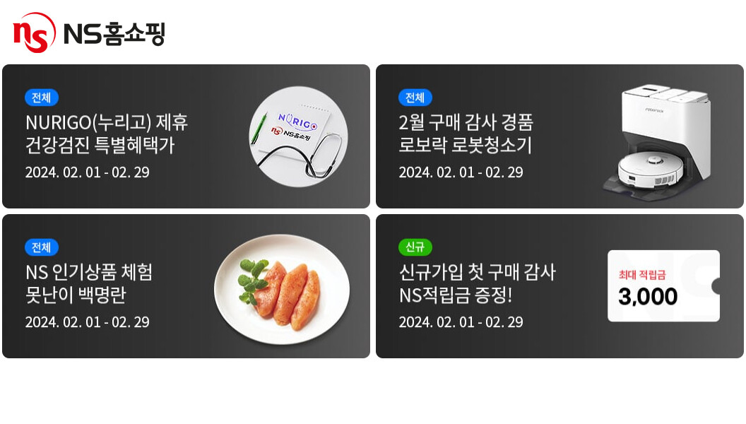[하비엔뉴스 = 윤대헌 기자] NS홈쇼핑은 오는 29일까지 NS몰과 앱에서 ‘NS멤버십 이벤트라운지 2월 멤버십 이벤트’를 진행한다고 6일 밝혔다.
