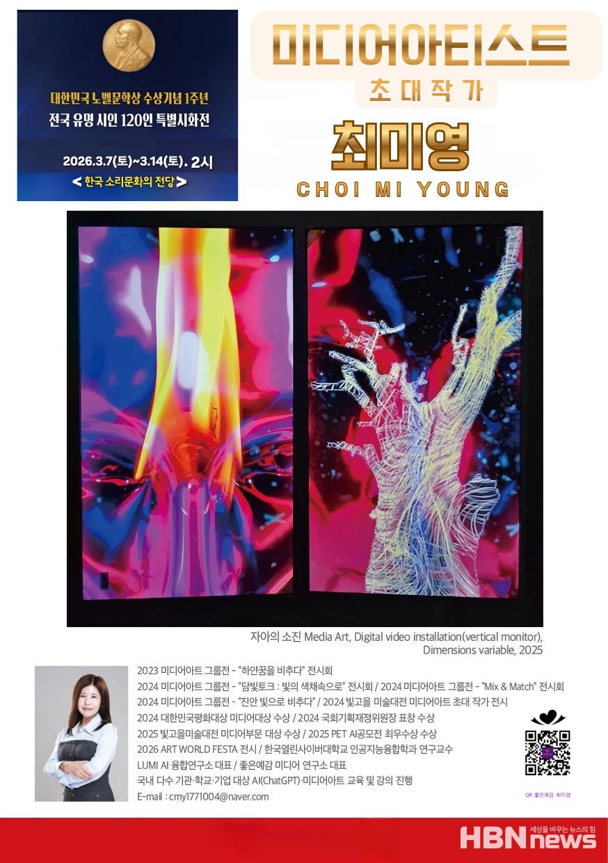 [HBN뉴스 = 이수준 기자] 미디어아티스트이자 AI 작가인 최미영 작가가 ‘대한민국 노벨문학상 수상기념 1주년 전국 유명 시인 120인 특별시화전’에 초대 작가로 참여해 미디어아트 작품〈자아의 소진(Exhaustion of the Self)을 선보인다.