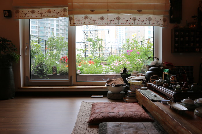 | ▲다실에 앉아 차를 마시며 옥상정원을 바라본다. |