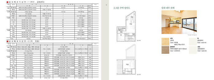 도면에 재료마감표가 있다. 방 바닥, 천장, 벽, 걸레받이, 몰딩에 어떤 재료를 사용하는지 정리한 표다. 그런데 글로만 되어 있어 실제 어떤 재료를 사용하는지 건축주가 한 눈에 알아보기 어렵다. 이를 보완하기 위해서 방 분위기를 유추할 수 있는 예시사진, 마감자재, 색상을 넣었다.