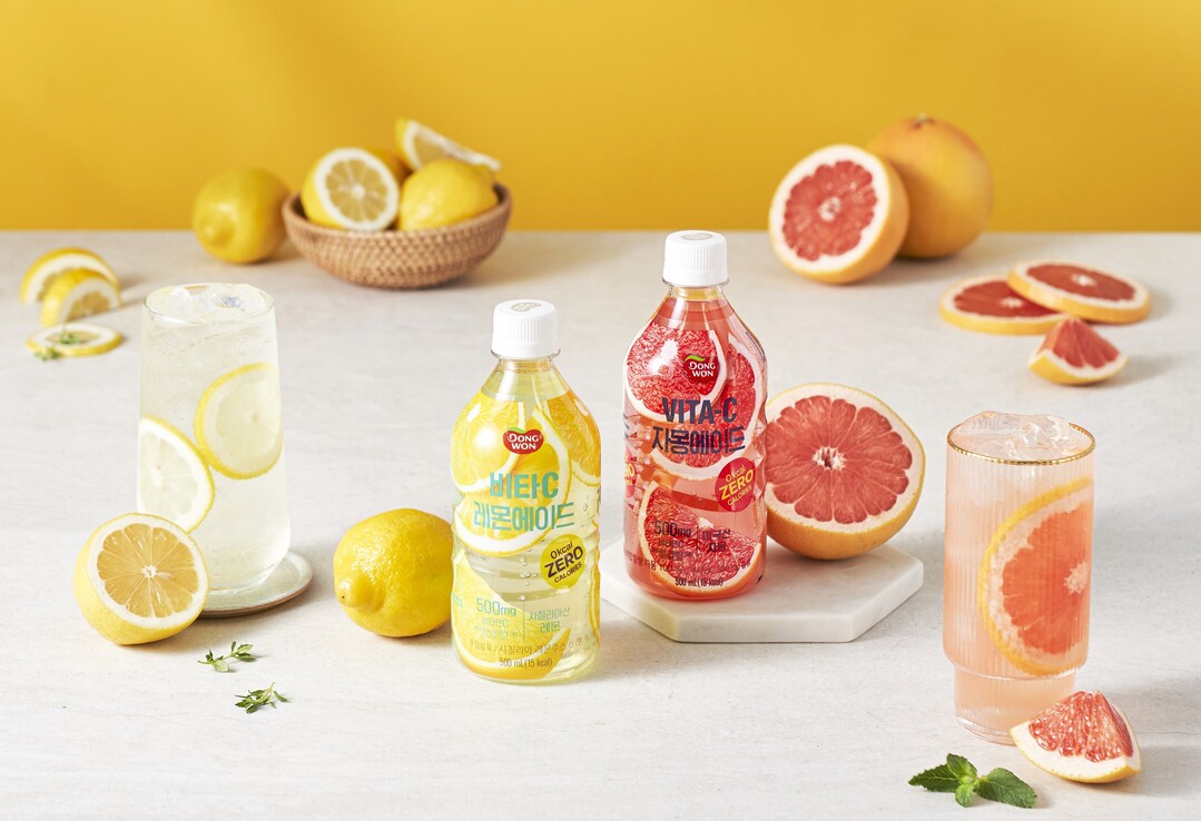 | 동원F&B에서 새롭게 선보인 제로 칼로리 음료 ‘비타C 에이드’ 2종. [사진=동원F&B] |
